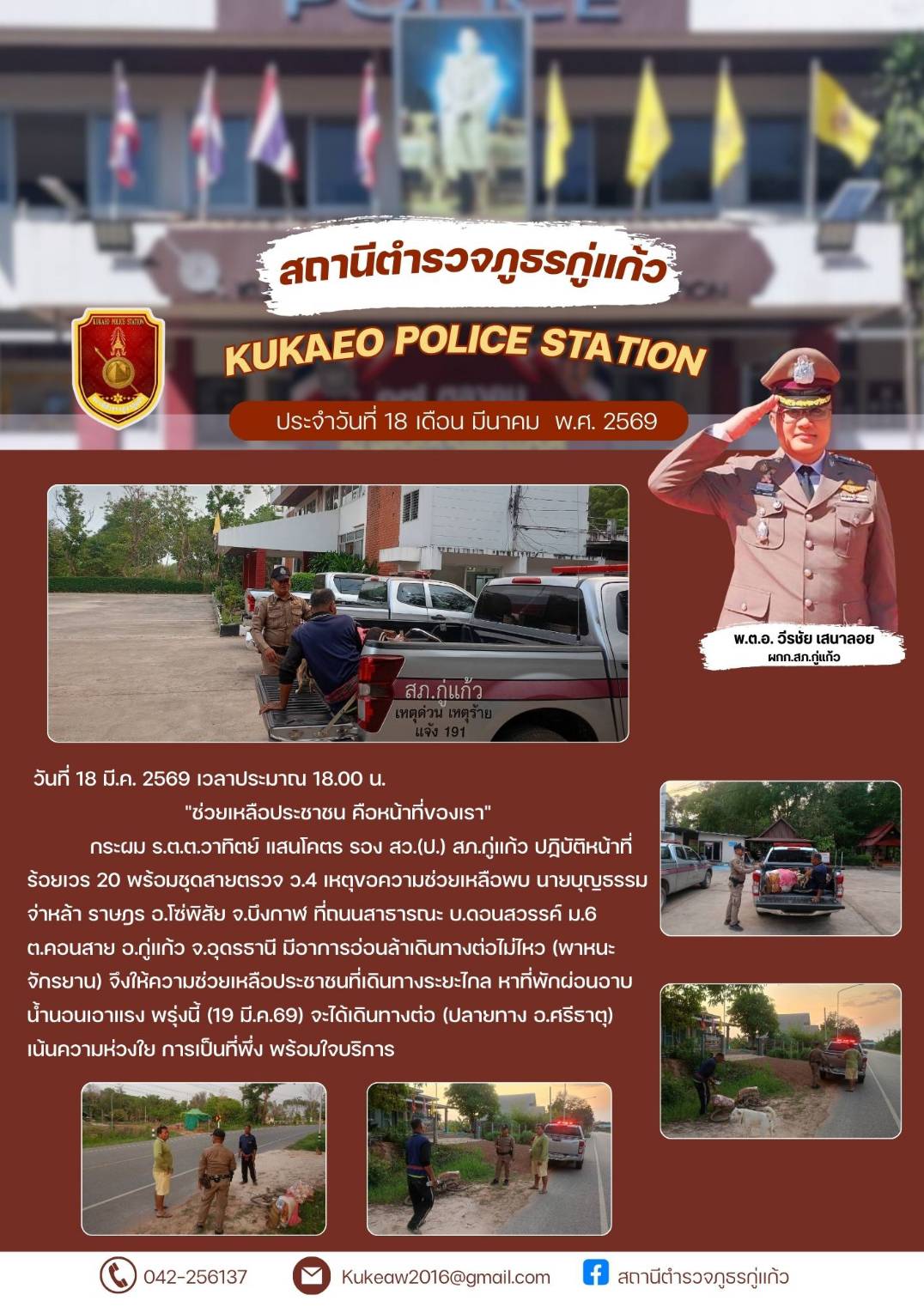 วันนี้ ( 18 ม.ค. 69) เวลา 18.30 น. พ.ต.ท.พงศกร ผันผ่อน รอง ผกก.(สอบสวน)สภ.กู่แก้ว พร้อมด้วยเจ้าหน…