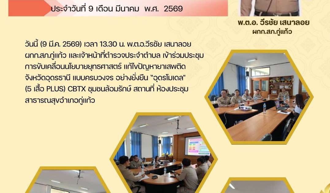 วันที่ 9 มี.ค.2569 เวลา 13.30 น. พ.ต.อ.วีรชัย เสนาลอย ผกก.สภ.กู่แก้ว และเจ้าหน้าที่ตำรวจประจำตำบล เข้าร่วมประชุมการขับเคลื่อนนโยบายยุทธศาสตร์ แก้ไขปัญหายาเสพวิตจังหวัดอุดรธานี แบบครบวงจร อย่างยั่งยืน “อุดรโมเดล” (5 เสื้อ PLUS) CBTX ชุมชนล้อมรักษ์ สถานที่